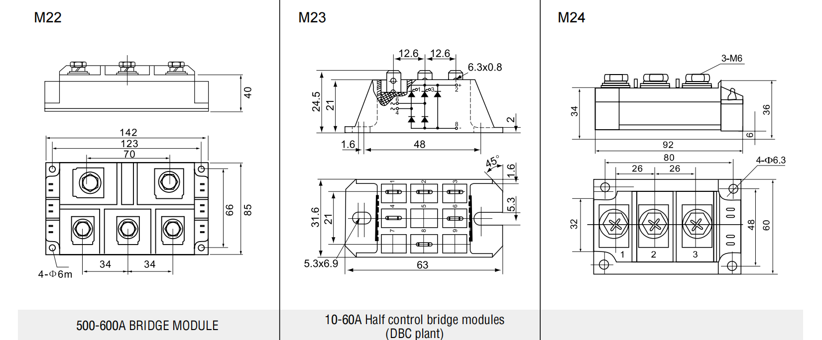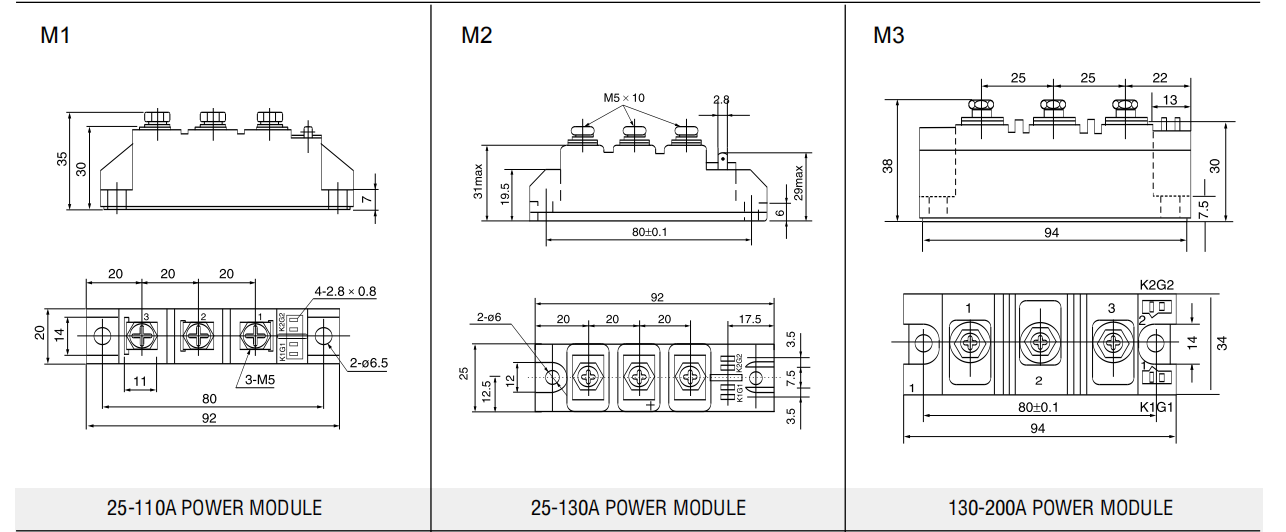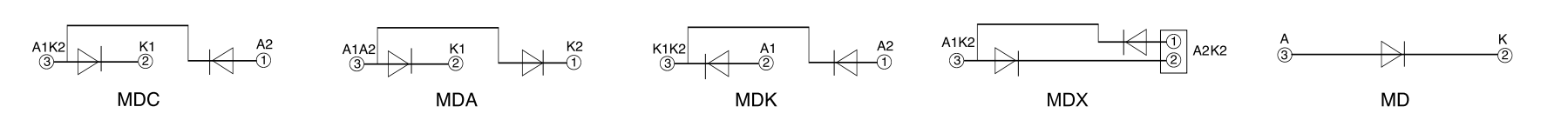 | MDC40A | 40 | 400-2600 | 1.55 | 120 | 8 | 63 | 1.00 | 0.900 | 150 | 2500 | M1/M2 |