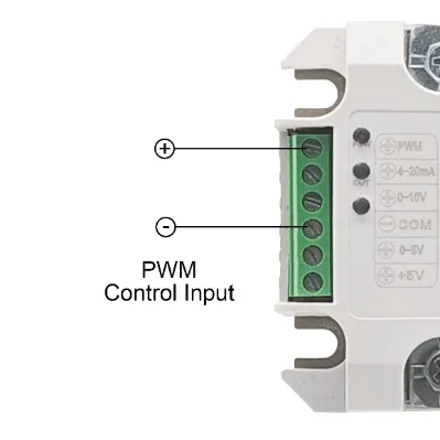Correct Polarity: All function terminals must remain positive relative to the COM terminal (negative). Reversed polarity may cause uncontrolled output. A higher control voltage results in a higher main-circuit output.
